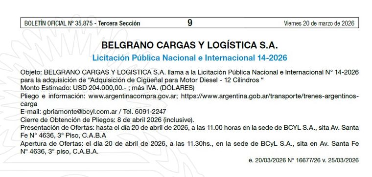 El Gobierno nacional ya publicó en el Boletín Oficial el llamado a licitación. El esquema contempla concesiones por hasta 50 años y la posibilidad de incorporar inversiones privadas para la operación y modernización del sistema ferroviario de cargas.